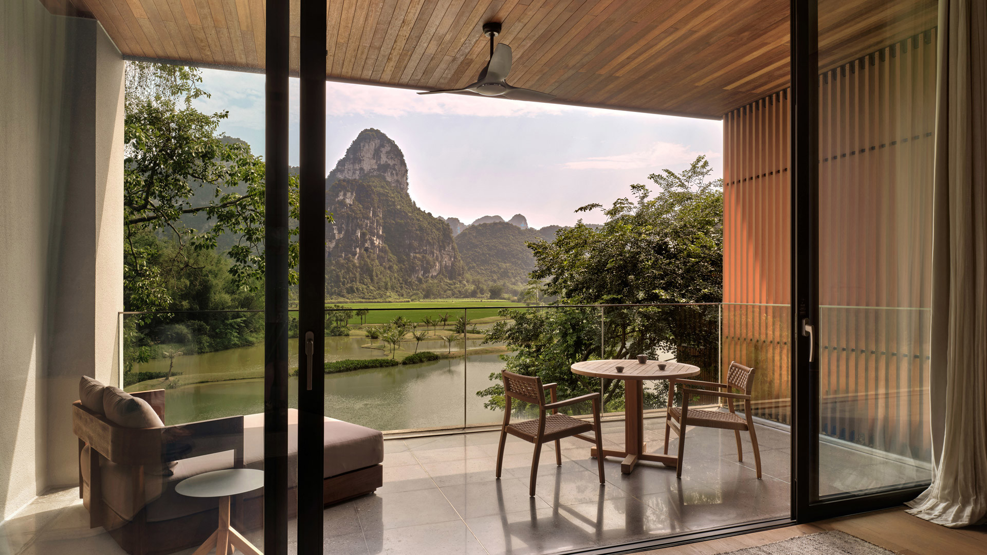 • Furnished outdoor terrace facing Mingshi River and surrounding Karst formations